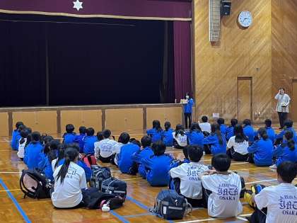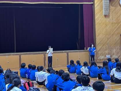 交通渋滞もなく、順調に学校まで帰ってきました。 体育館で学級委員、教頭先生、看護師さん、学年の先生から一言頂き、15:00頃解散予定です。