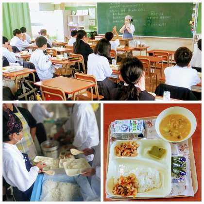 5月22日(水)、今日の献立は、かやくご飯(きざみのり)、味噌汁、抹茶ういろう、牛乳です。『抹茶』とは、お茶の葉を蒸して乾燥させ、「臼(うす)」で粉状に細かくしたものです。緑茶やウーロン茶、紅茶も、抹茶と同じお茶の葉から作られます。抹茶はお菓子や料理としても使われています。【今日の給食では、「抹茶ういろう」として登場します。】