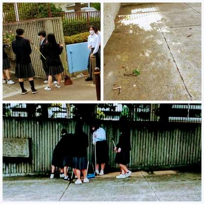 6月6日(木)、正門前の清掃は、昨日のカラスのいたずらで木々の枝や桜の葉が散乱していました。また、サツキの枯れた花びらも少しあり清掃してくれました。