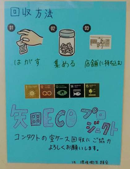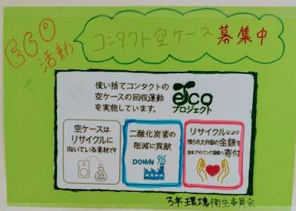 3年環境衛生委員会からの「使い捨てコンタクトの空ケース回収を実施しています。」というお知らせポスターが掲示されていました。