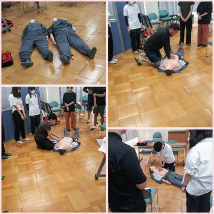2階多目的室にて、教職員が2体のダミー人形の周りで、心肺蘇生法の実習を行いました。
