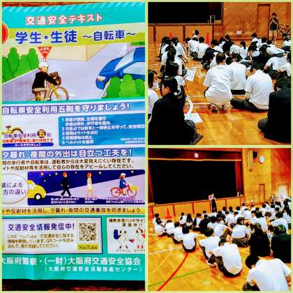 7月12日(金)4限目、体育館にて、全校生徒に対して、東住吉警察交通安全総務課の方から『交通安全テキスト』を使って交通ルールについての学習を聴きました。