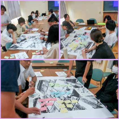 今回の研修会を受けて、グループワークをしました。「矢田」についてのイメージを付箋紙を使って思い思いに書いてもらいグループ内で発表していただきました。