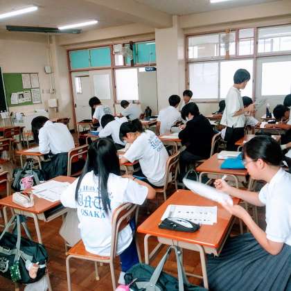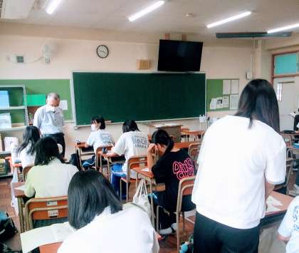 8月19日(月)、2年生が、夏休み後半の学習(英語)をやっていました。1・2組合わせて、約20名の生徒たちが頑張って自学自習していました。