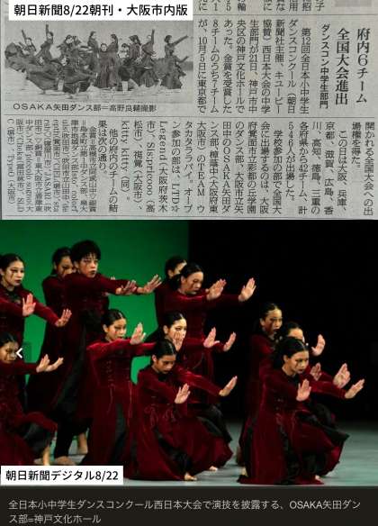 8月21日(水)、神戸文化ホールで行われた全日本小中学生ダンスコンクール西日本大会(詳細は下記朝日新聞記事参照)において、金賞を受賞し、10/5に東京代々木体育館で開催される全国大会への出場を決めました。