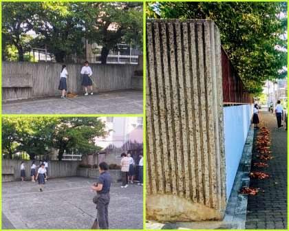 8月30日(金)、正門前や運動場横道路側の桜の落ち葉の清掃を登山部とダンス部の生徒たちが綺麗に掃き集めてくれていました。