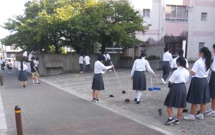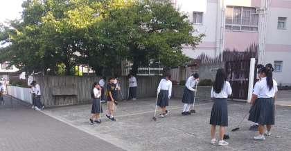 9月9日(月)、正門前の清掃活動の様子です。バスケットボール部員たちが綺麗にしてくれていました。