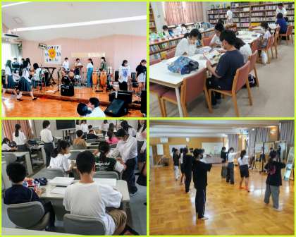 校舎内、4階では多目的室にて、ダンス部が躍動していました。軽音楽部にもたくさんの児童たちが集っていました。美術部は、LL教室にて、活動していました。2階図書室では、図書読書部が児童たちと読書を楽しんでいました。