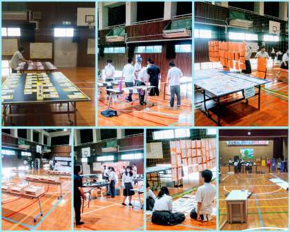 明日の文化祭展示発表に向けての準備が体育館にて行われます。本日の舞台発表後、給食を済まし椅子を片付けてからの作業の様子です。