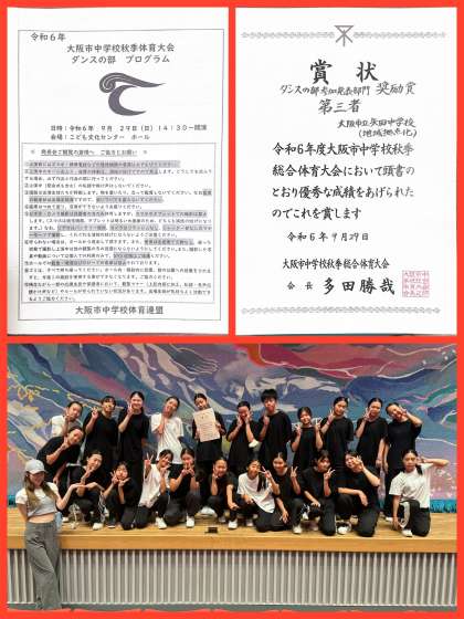 参加発表部門に出場し、奨励賞を頂きました。この作品は、8月に行われたダンスコンクール西日本大会の「第三者」をさらにレベルアップさせた物で、ダンスコンクール全国大会でも披露することになっています。ご観覧頂きました皆様、いつもありがとうございます。これからもダンス部にご声援をよろしくお願いします。