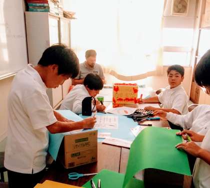 10月21日(月)放課後、談話室にて、生徒会の生徒たちが赤い羽根募金のポスターや募金箱を作っていました。