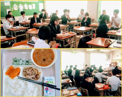 11月7日(木)、今日の配膳は、ごはん、豚肉と野菜の炒め物、かぼちゃのういろう、焼きのり、イワシのつみれ汁、牛乳です。『イワシのつみれ汁』は、魚を骨ごとミキサーやすりばちですり身にしたものを、手で摘み、湯に入れることからつみれ(摘み入れ)といいます。また、イワシだんごにしょうが汁をかけて臭みをとっています。【イワシの脂質には、脳の働きをよくするDHA(ドコサヘキサエン酸)や血液の流れをよくするEPA(エイコサペンタエン酸)が豊富に含まれています。