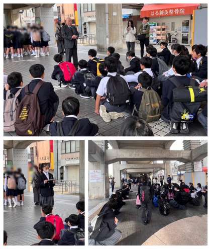 11月8日(金)、今日は1年生の校外学習です。 9:00に矢田駅に集合して、 出発式を行いました。 これから電車に乗って あべのハルカスへむかいます。