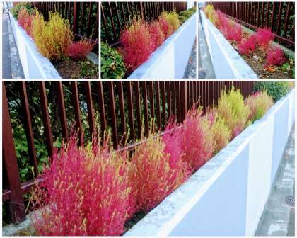 秋が深まりつつある正門前のコキアの様子です。もうすぐ黄緑色から赤系に色づくようです。