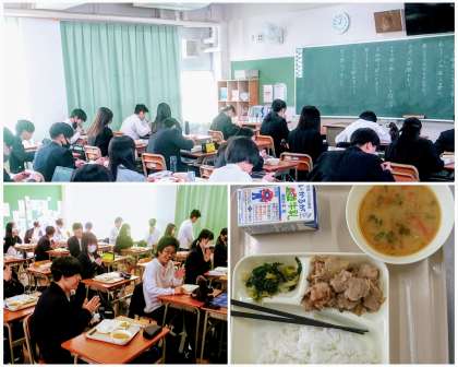 12月5日(木)、今日の配膳は、ごはん、豚肉の生姜焼き、さつまいもの味噌汁、菊菜と白菜のゴマあえ、牛乳です。『地場産物』とは、住んでいる地域で作られた食べ物のことをいいます。近い場所で作られ、運ばれるので、新鮮な物が手に入ります。地場産物を学校給食に使用することで、地域の食や食文化などについて理解を深めることができます。【大阪市の給食では、大阪産の菊菜をできるだけ使うようにしています。】
