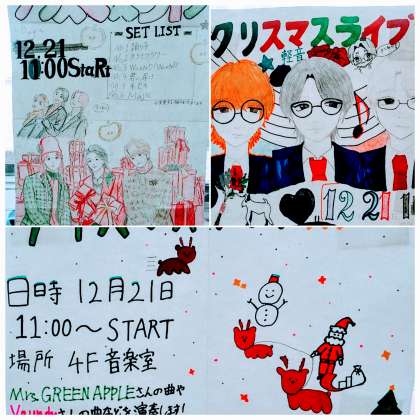 12月21日(土)11:00〜 4階軽音楽部部室にて、「クリスマスライブ」が開催されます。