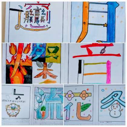 1年生の廊下に「漢字のレタリング」作品が展示されています。写真は、その一部です。