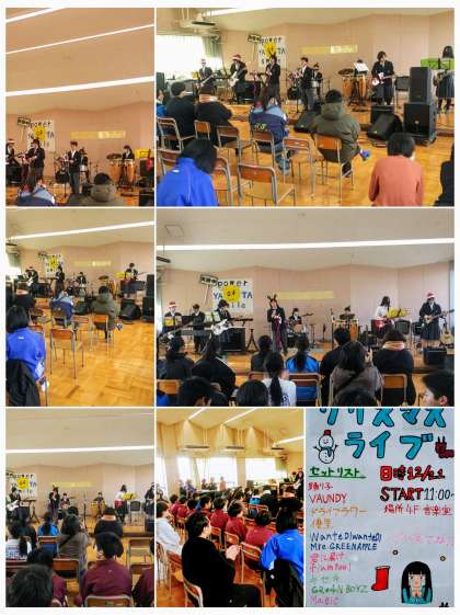12月21日(土)、4階音楽室にて、軽音楽部によるクリスマスライブが行われました。たくさんのお客さんを迎えて堂々とした演奏でした。ご苦労様でした。
