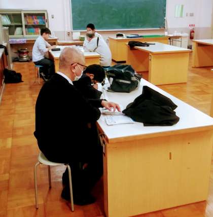 2月7日(金)、私立高校入試事前指導後、被服室にて、3名の生徒たちが自学自習していました。