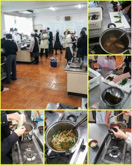 2月10日(月)2限目、2組は、調理室で、昆布と鰹節からダシをとり、班によっては、ダシを取った昆布を刻んだものとネギを刻んだものを使った『かけうどん』の調理を行いました。