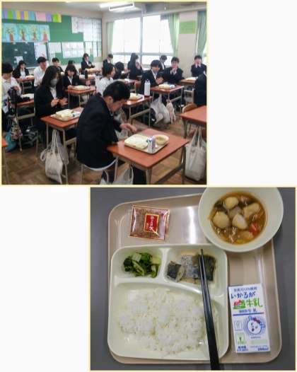 3月12日(水)、今日の配膳は、ごはん、サゴシのおろし醤油かけ、里芋と野菜の含め煮、菜の花のおひたし(鰹節)、牛乳です。『菜の花』は、アブラナ科の花で、「なばな(菜花)」や「はなな(花菜)」とも呼ばれます。ほろ苦さに特徴がある緑黄色野菜で、カロテンやビタミン類のほかに、カルシウム、鉄なども多く含んでいます。主に蕾(つぼみ)と葉、茎の部分を食べる、春が旬の野菜です。