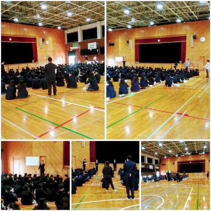 4月8日(火)、体育館にて、始業式が行われました。校長先生のお話しがあり、校長先生から学年の先生方の紹介がありました。最後に対面式が行われました。