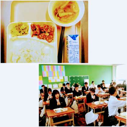 4月10日(木)、今日の配膳は、ごはん、鶏肉の竜田揚げ、キャベツの梅風味、五目汁、牛乳です。エネルギー824kcal。