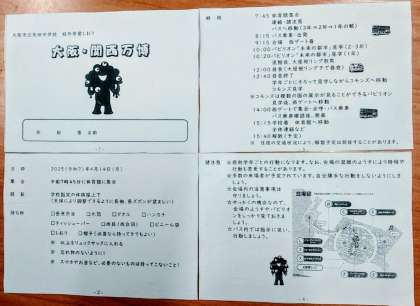 大阪市立矢田中学校では、4月14日(月)に大阪・関西万博に校外学習に行きます。生徒集合は、午前7時45分に学校指定の体操服上下で体育館に集合です。リュックサックに昼食弁当、水筒、タオル、ハンカチ、ティッシュペーパー、雨具(雨合羽)、ビニール袋、しおり、帽子(必要なら持ってきてもよい)、8時15分バス乗車・出発。9時15分頃会場西ゲート着。原則学年ごとの行動が10時からスタート。14時頃万博会場を後にします。15時15分頃学校着。15時40分解散予定。なお、交通状況により、解散予定は前後することがあります。