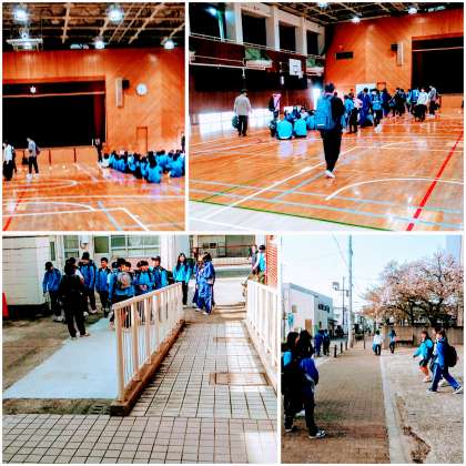 4月14日(月)、万博会場を14時過ぎに出発し、バス乗車し、15時10分頃に、矢田中学校に帰校し、体育館にて、学年ごとに解散しました。