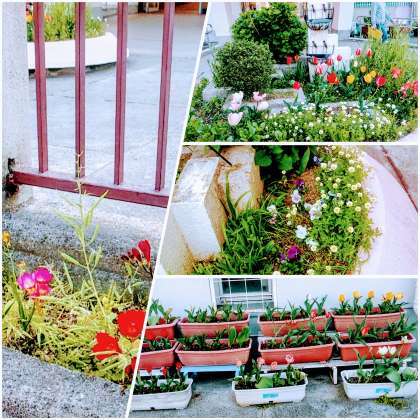 ソメイヨシノが葉桜になり、満開だった山桜も一雨ごとに葉桜になりつつ中、玄関前の草花が元気よく華やいでいます。