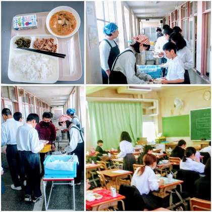 4月17日(木)、今日の配膳は、ごはん、豚肉の生姜焼き、じゃこピーマン、豆腐の味噌汁、牛乳です。『ちりめんじゃこ』は、イワシの子どもを乾燥させたものです。体をつくるもとになる食べ物です。骨や歯を丈夫にする働きがあるカルシウムが多く含まれています。