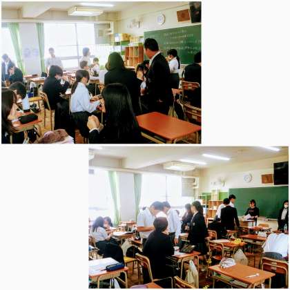 4月28日(月)1限目、教室にて、自己紹介(下書きと清書)プリントを製作していました。さらに、修学旅行表紙もやっている生徒もいました。