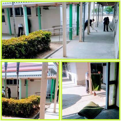 正門周辺の桜が散り、葉桜になりました。そこで、清掃場所は、校内の廊下や階段へと場所が変わりつつも部活動生徒たちは毎朝頑張って清掃活動をしてくれています。