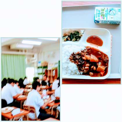 5月20日(火)、今日の配膳は、牛肉と大豆のカレーライス、レタスとコーンのサラダ、棒チーズ、牛乳です。『大豆』は、植物ですが「畑の肉」とも呼ばれています。それは、肉のように、たんぱく質を多く含んでいるからです。他にも、脂質やカルシウム、鉄などを含む栄養豊富な食べ物です。