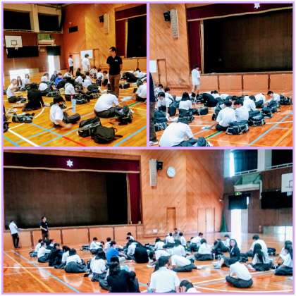 6月6日(金)、1年生は、10時登校で、プール横の門から直接、体育館に入場し、2日間の一泊移住の反省などをしおりのページに書いていました。また、一泊移住の思い出を作文するための準備も兼ねています。