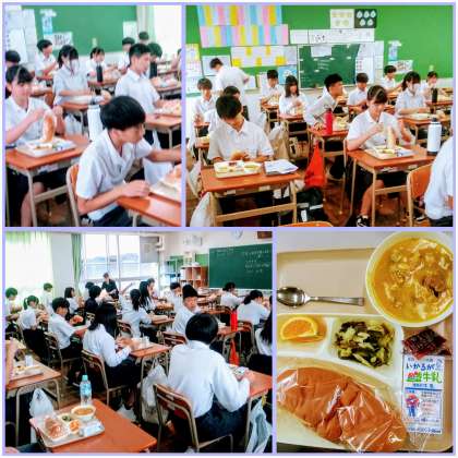 6月11日(水)、今日の配膳は、コッペパン、ミックス海藻のサラダ、オレンジ、鶏肉とかぼちゃのシチュー、苺ジャム、牛乳です。『海藻に含まれる栄養素』「海藻」には、お腹の調子を整える食物繊維や、貧血予防の効果がある鉄、骨や歯を作るもとになるカルシウム、心身を元気にするヨウ素などが豊富に含まれています。【今日の給食の「ミックス海藻のサラダ」には、ワカメ、茎ワカメ、昆布、赤とさかのりが使われています。】