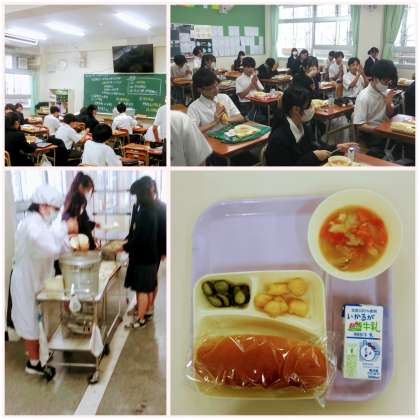 6月16日(月)、今日の配膳は、パンプキンパン、きゅうりのバジル風味サラダ、いか天ぷら、フレッシュトマトのスープ煮、牛乳です。『バジル』は、紫蘇科の香草(ハーブ)です。青じそに似た甘い香りとわずかな辛味が特徴で、人気があります。イタリア料理のスパゲッティやピザ、トマトソース、サラダ、シチュー、スープなどに使われています。食欲を増し消化をよくするなどの効果があります。【今日の給食では、「きゅうりのバジル風味サラダ」に乾燥バジルを使っています。】