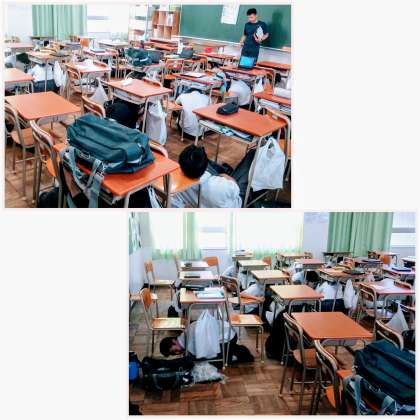 6月19日(木)6時限目、地震発生の放送で、机の下に身体を隠している様子です。