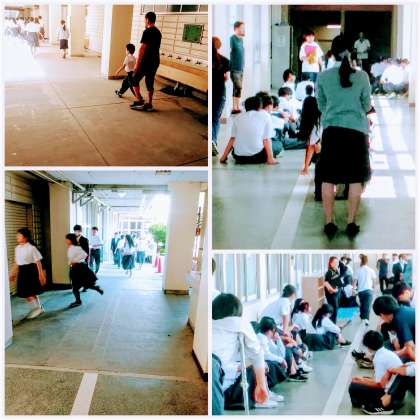 続いて、とても暑い校庭から津波を想定した避難が行われました。1階から階段を使って、4階まで上がり点呼をとり、訓練が終わりました。ご苦労様でした。