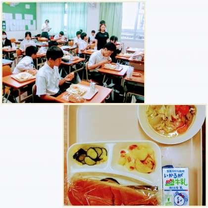 7月2日(水)、今日の配膳は、黒糖パン、ジャーマンポテト、きゅうりとコーンのサラダ、鶏肉と野菜のスープ煮、牛乳です。『じゃがいも』は、世界の多くの国々で生産されています。日本では、北海道や鹿児島県、長崎県などで栽培させています。炭水化物が多く含まれているので、じゃがいもを主食にしている国もあります。【今日の給食には、じゃがいもとベーコンを使った「ジャーマンポテト」が出ました。】