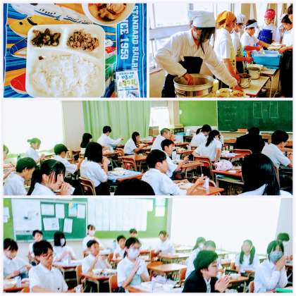 7月10日(木)、今日の配膳は、ごはん、オクラの梅風味、ツナっ葉炒め、鶏肉と一口がんもの煮物、牛乳です。『大根葉』は、緑黄色野菜の一つです。骨や歯をつくるもとになるカルシウム、皮膚や喉、鼻の粘膜を健康に保つカロテン、体の抵抗力を高めて風邪を予防するビタミンC、血液をつくるもとになり貧血を防ぐ鉄などの栄養素が多く含まれています。【今日の給食では「ツナっ葉炒め」に使われています。】