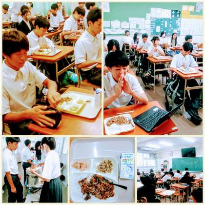 7月15日(火)、今日の配膳は、牛丼、もやしとピーマンの胡麻炒め、大福豆の煮物、牛乳です。『大福豆』は、いんげん豆の仲間です。色が真っ白で、粒が大きいのが特徴です。不足しやすい鉄や食物繊維などを含んでいます。主に、北海道の胆振(いぶり)地方や北見地方で、栽培されています。