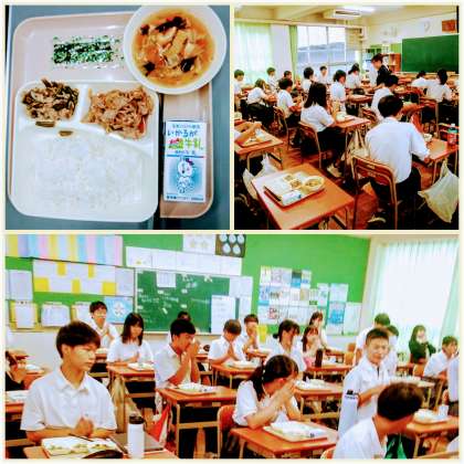 7月17日(木)、今日の配膳は、ごはん、豚肉の生姜焼き、ツナと野菜の炒め物、五目汁、焼き海苔、牛乳です。『豚肉』には、体をつくる「たんぱく質」が多く含まれています。また、牛肉や鶏肉と比べ、炭水化物をエネルギーに変える働きのある「ビタミンB?」を多く含んでいます。