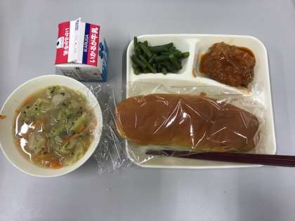 本日の給食は、ハンバーグとインゲン豆、野菜たっぷりスープに、パンと牛乳です。