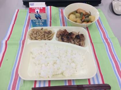 鶏肉のてり焼き、じゃがいもとあつあげの煮もの、ごまかかいため、ごはん、牛乳です。
