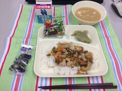 かやくご飯、みそ汁、まっ茶ういろう、豆こんぶ