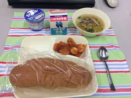 えびのチリソース、中華スープ、ヨーグルト、コッペパン、牛乳