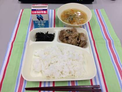 豚肉のごまみそ焼き、すまし汁、のりのつくだ煮、ごはん、牛乳