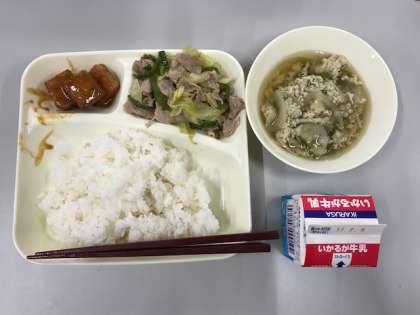 豚肉と野菜の炒めもの、かきたま汁、あつあげのみそだれかけ、ごはん、牛乳