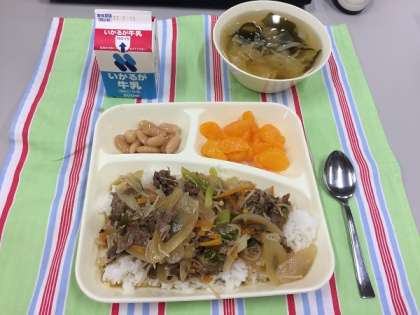 牛丼、すまし汁、大福豆の煮もの、みかんの缶詰